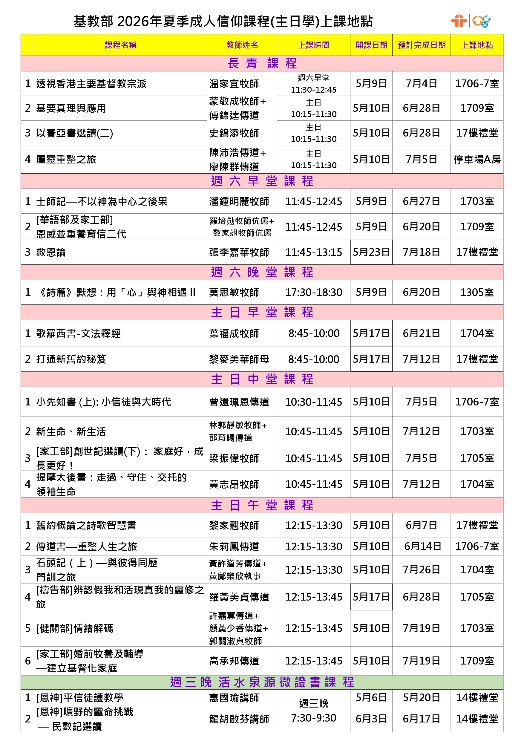 點擊這裡 查閱/下載「新生命、新生活」 [主日中堂10:45-11:45] 課程編排及注意事項
