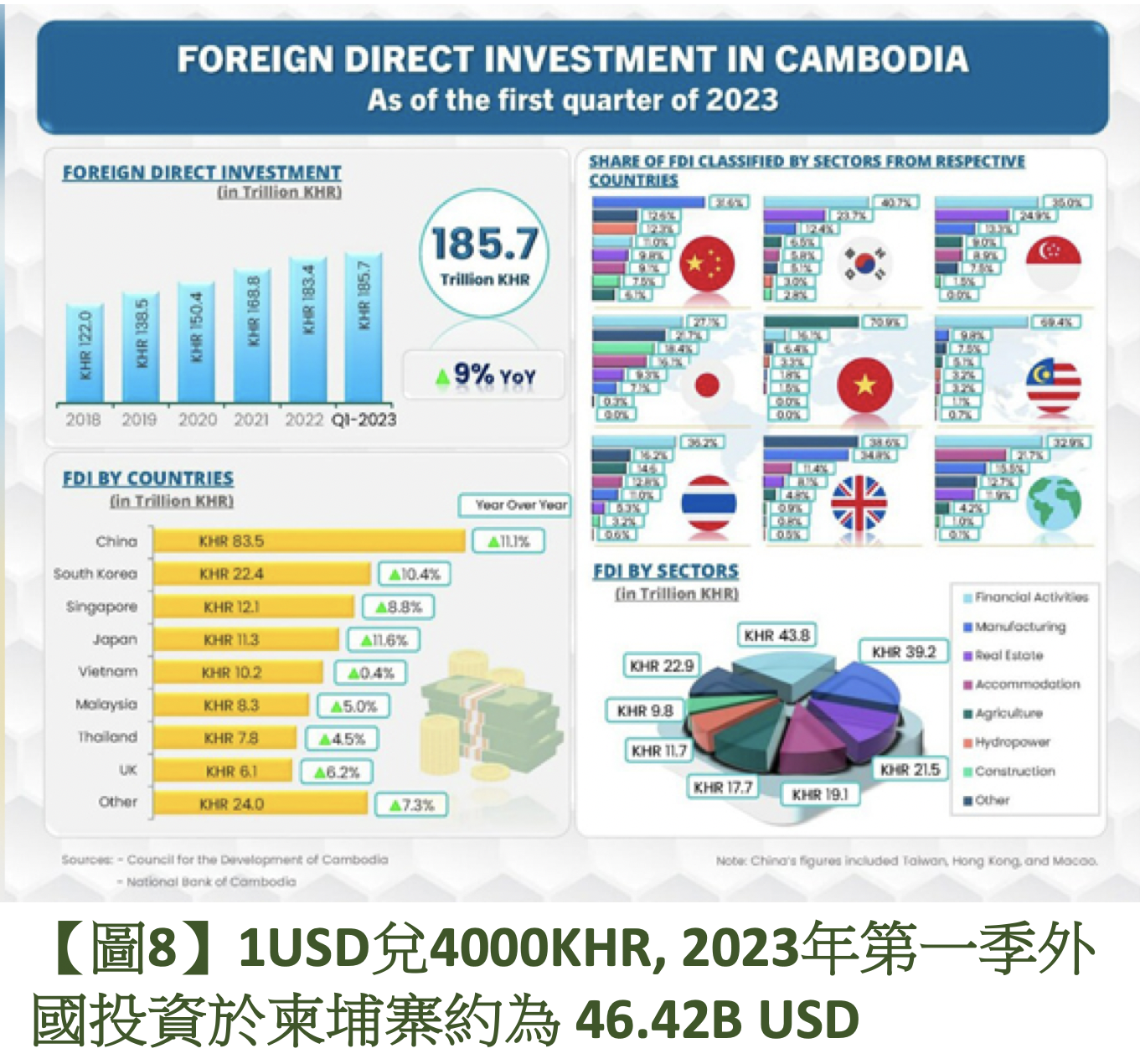 ,柬埔寨與印度一樣,人口平均年齡十分年輕,人口以年輕家庭為主,推算為一家七口(1位長者、年輕夫婦、3名子女)。柬埔寨與越南位於東盟十國中心點(3小時的經濟圈),同時也是中國「一帶一路」東南亞地區的樞杻【圖5】。正因是東南亞客貨轉運中心,不少外國投資流入柬埔寨。雖曾受疫情影響,2020年GDP 出現負增長 【圖6】,但及後開始重拾上升趨勢,2023年第一季外國投資總額(46.42B USD)已超越2021年第一至第二季外國投資總額 (39B USD)。