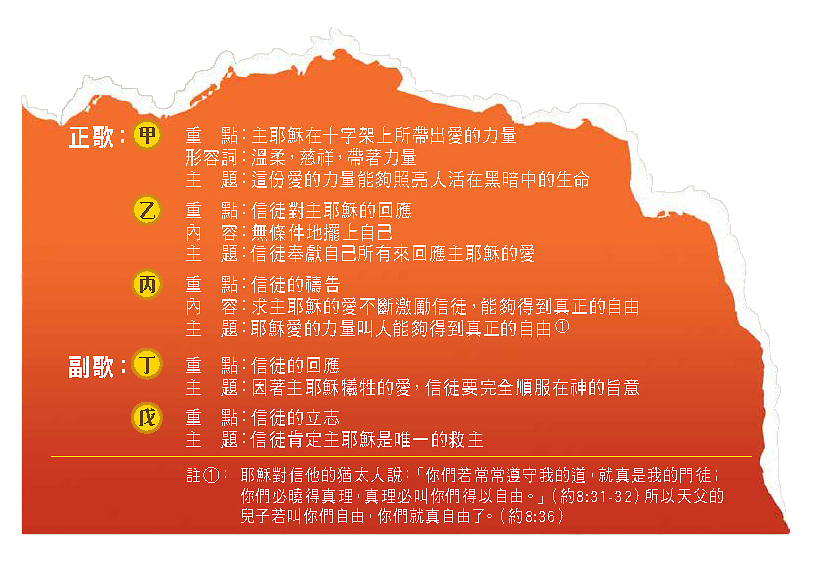 诗歌的歌词清楚地表达正歌及副歌之间的逻辑,其主要的骨幹是因耶稣的牺牲而
