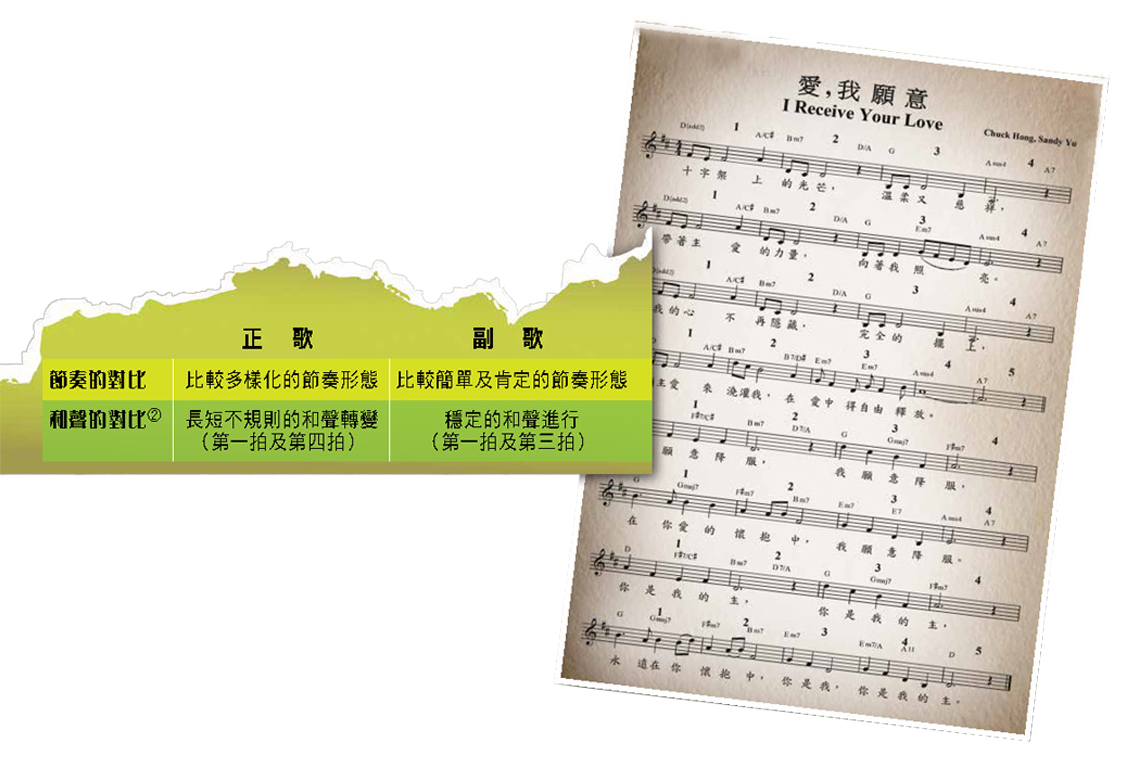总括来说,正歌比较多变化的音乐能表达耶稣爱的力量及爱的动力;副歌的稳定则最能够表达信徒内心的感恩及立志。因此,唱颂者在演绎副歌时应採用比较稳定及肯定的声音来表达其「立志」。