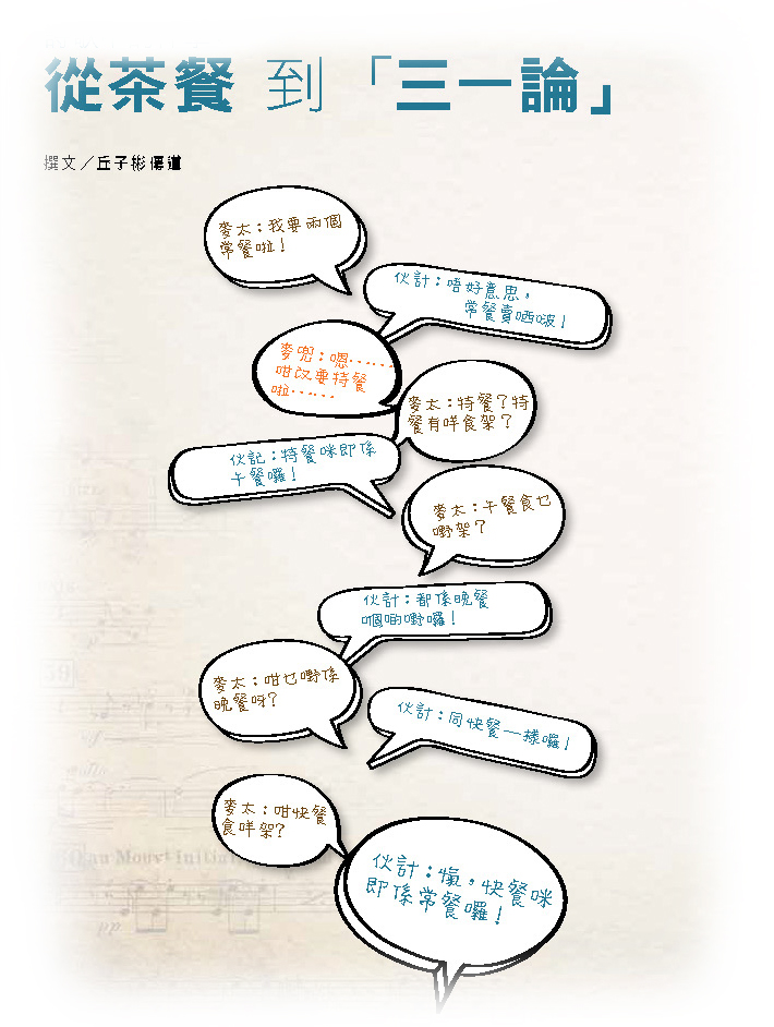 都会听过以上令人捧腹大笑的对白。现实中亦一样,我们不难发现教会附近的茶餐厅,不论是午餐、茶餐及常餐,甚或是晚餐,总有一些不过是换了叫法(价钱也不一样),却又是相同的食物。我们笑以上的对白,是因为对白内容和事情的荒谬。但是,我们的信仰又有没有同样的盲点?有没有「常餐即特餐,特餐即午餐,午餐即常餐」的情况出现?其实,这种情况不时在我们的祷告,甚至是唱诗时发生:「亲爱的天父,感谢你赐下救恩,死在十字架上,为我们流出宝血……」这样一来,会众就可能会混同三位一体的概念。