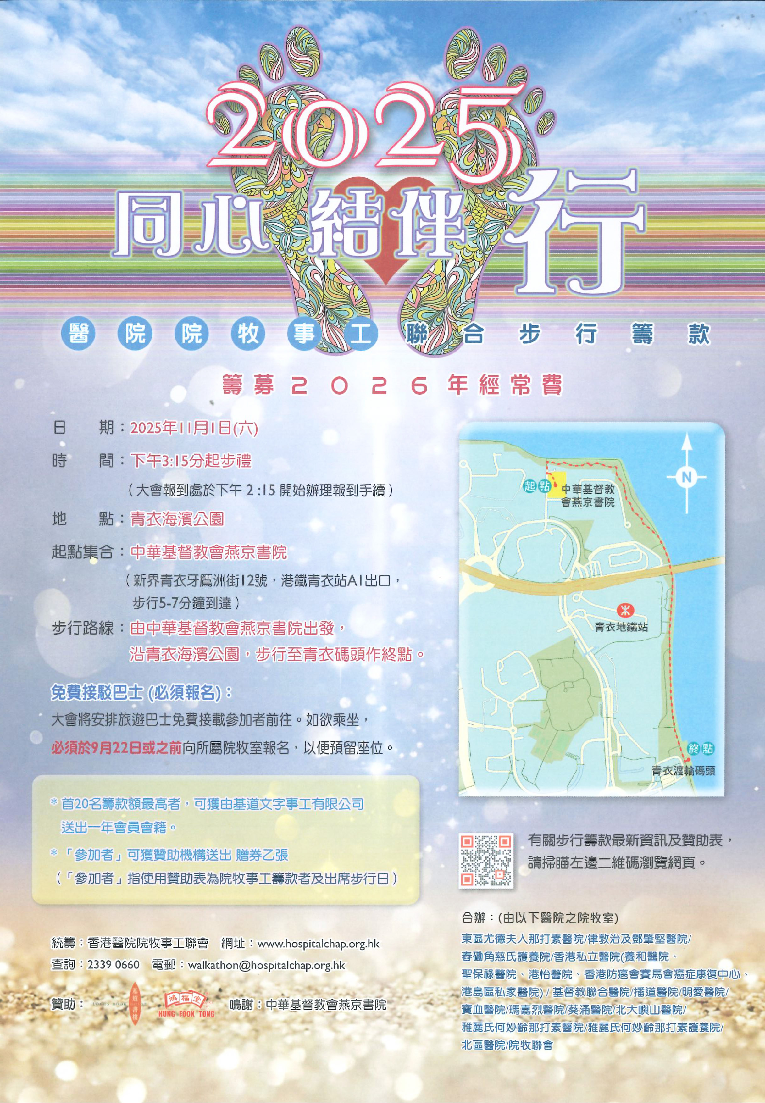 香港醫院院牧事工聯會將於2025年11月1日舉辦聯合步行籌款,為各醫院院牧部籌募2026年度經費。為了給日益上升的住院病人及其家屬提供適切的心靈安慰,誠邀大家慷慨解嚢,踴躍參與。