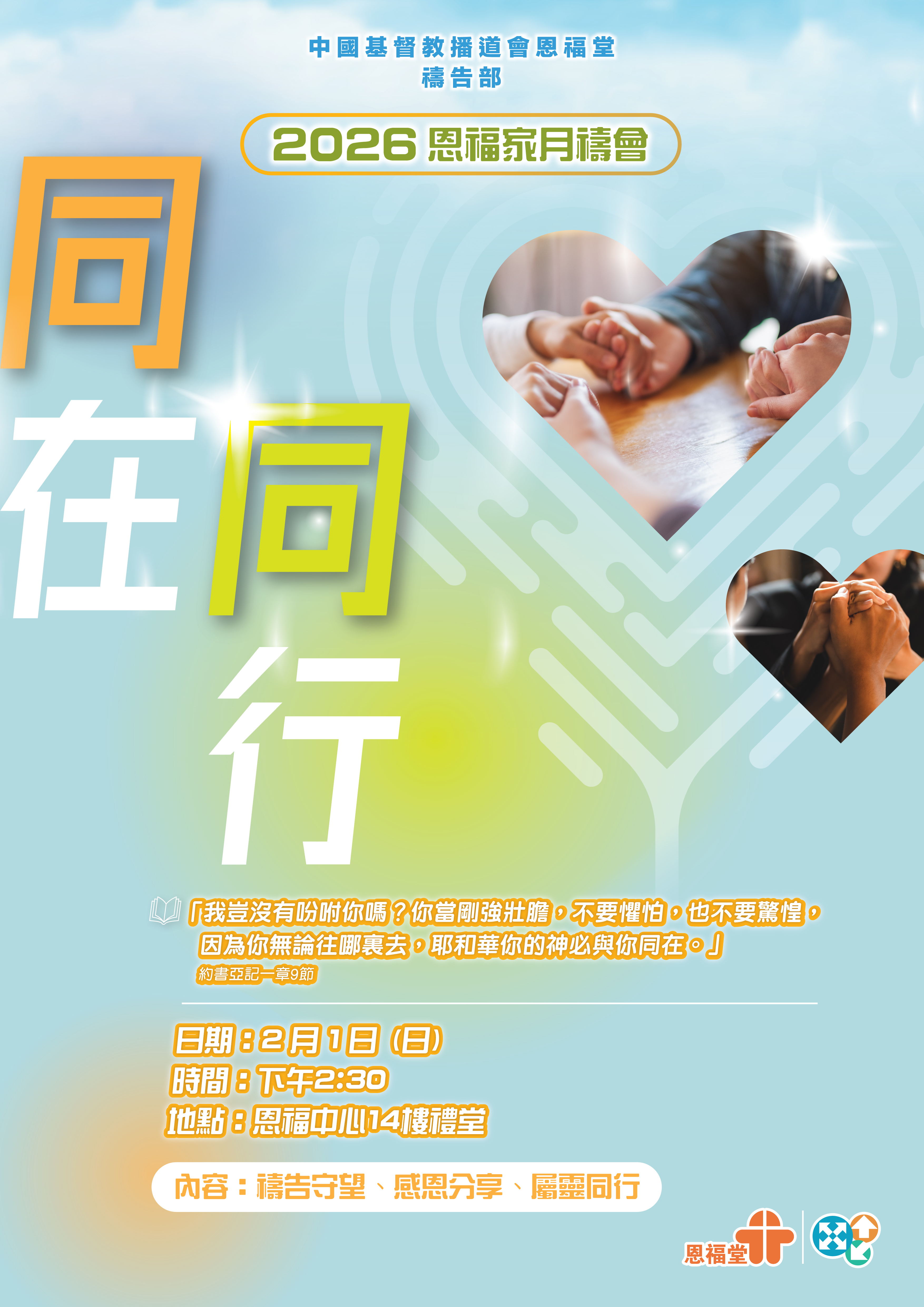 2026年第一次「恩福家月禱會」將會在2月1日 (日),下午2時30分,在恩福中心14樓禮堂舉行。 今年主題是「同在.同行」,盼望我們一同察驗神的同在,並與有需要的肢體和鄰舍同行,讓我們以禱告守望世界、香港和恩福家。