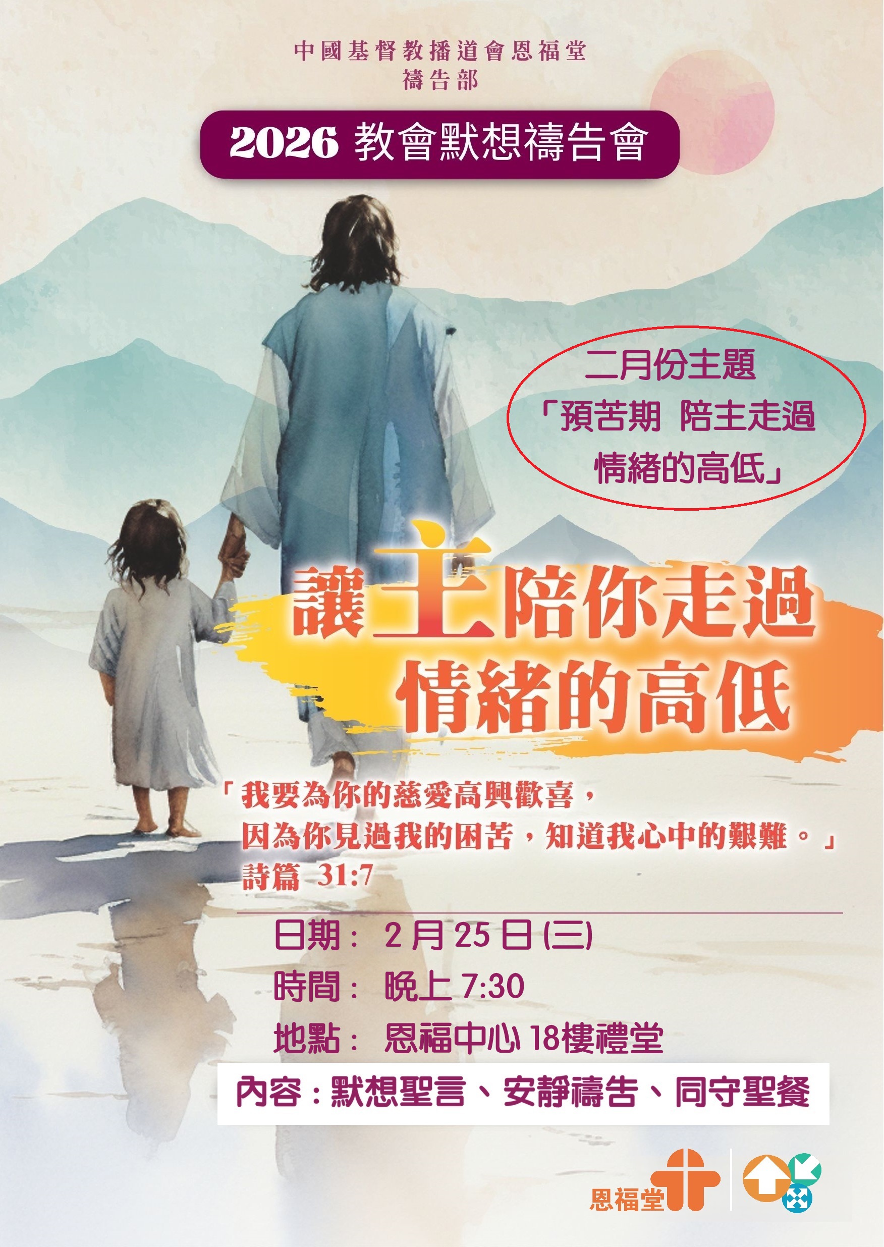 2月25日 (三) 晚上 7:30 舉行「教會默想禱告會」,2月份的主題是「預苦期 陪主走過情緒的高低」。邀請大家來恩福中心18樓禮堂,默想聖言、安靜禱告、同守聖餐。