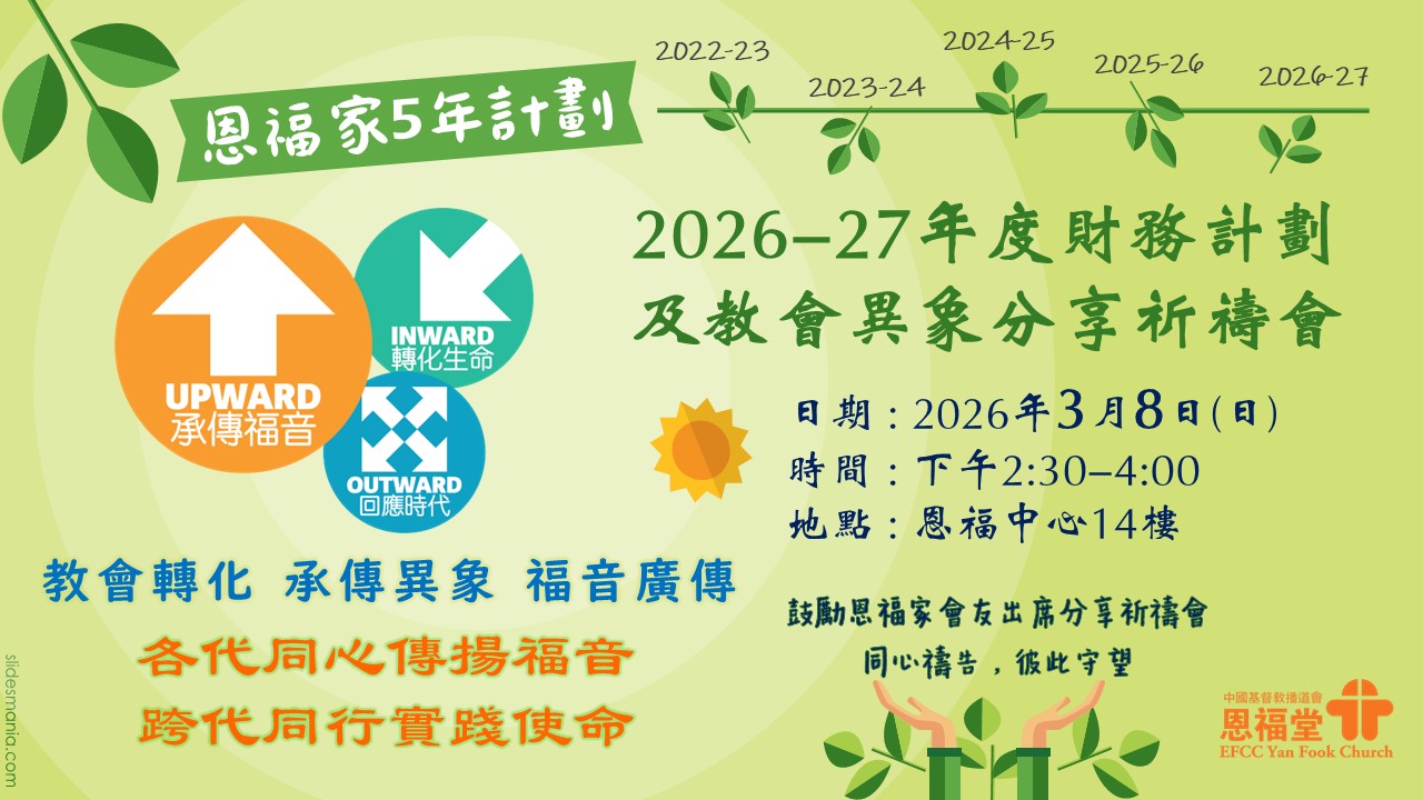 「2026-27年度財務計劃及教會異象分享祈禱會」,將於3月8日下午舉行,鼓勵恩福家會友出席分享祈禱會,同心禱告,彼此守望。