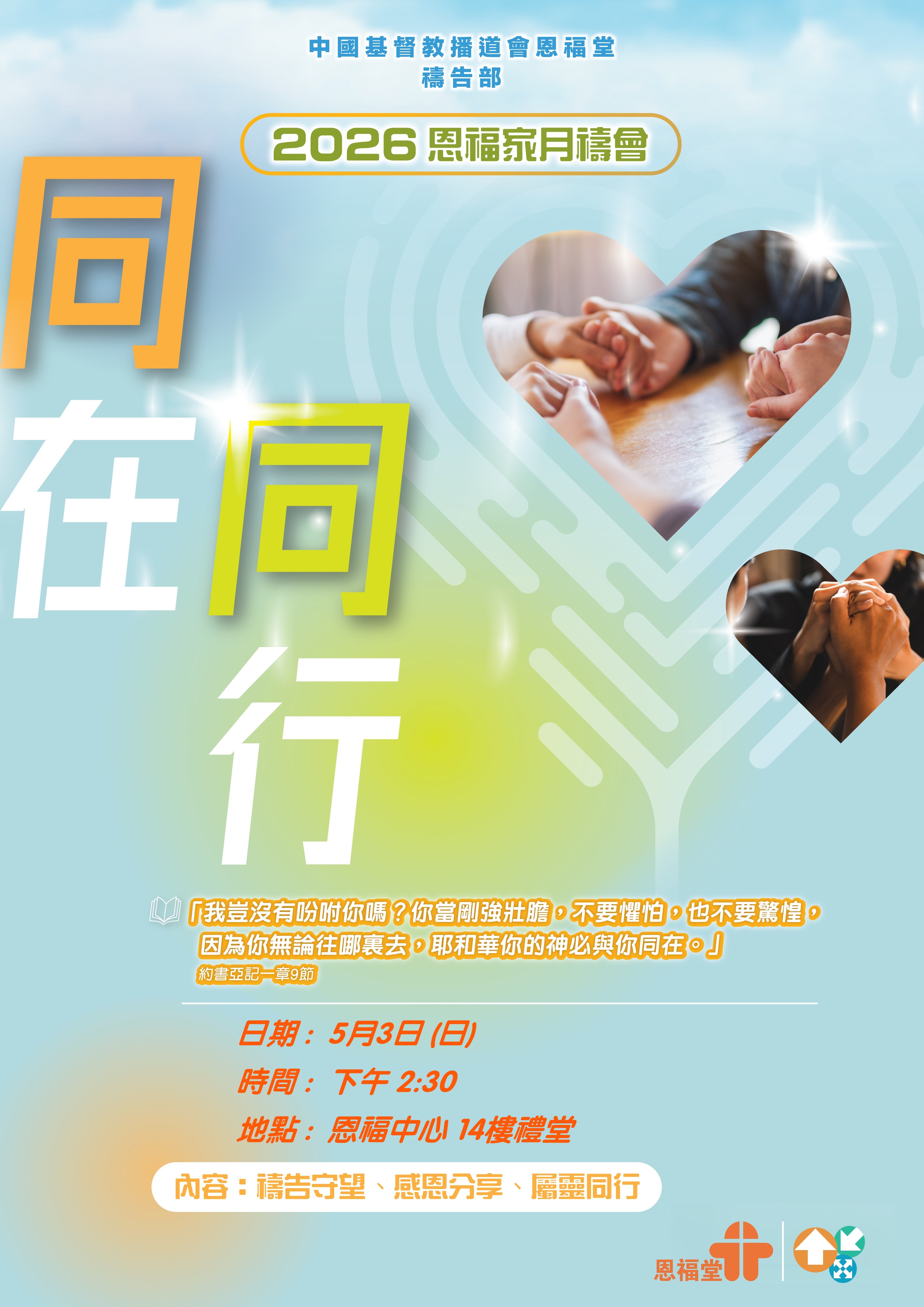 2026年5月3日 (日) 「恩福家月禱會」(2026年5月) - 今年主題是「同在.同行」
