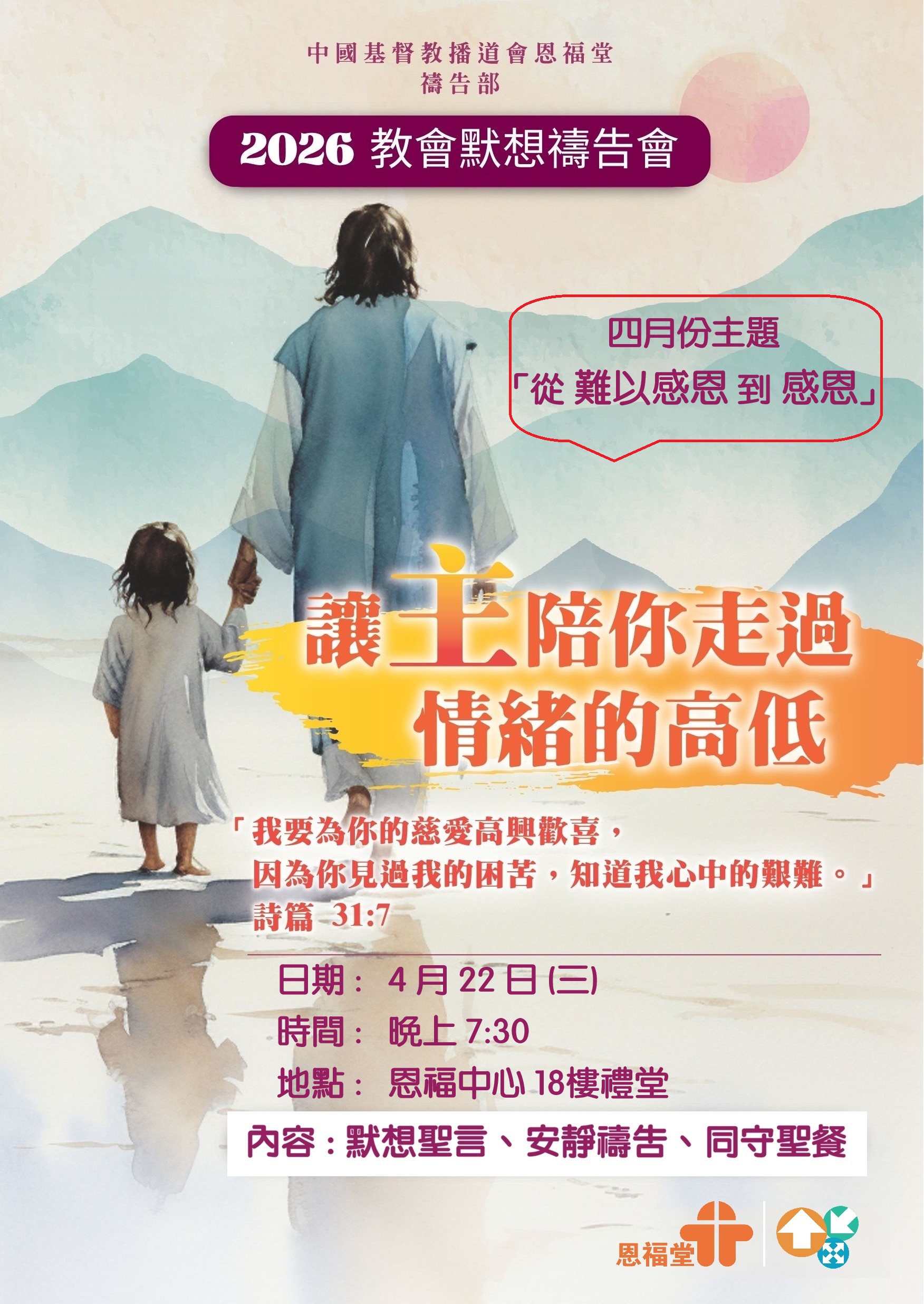 2026年4月22日 (三) - 教會默想禱告會 - 4月份主題是「從難以感恩到感恩」