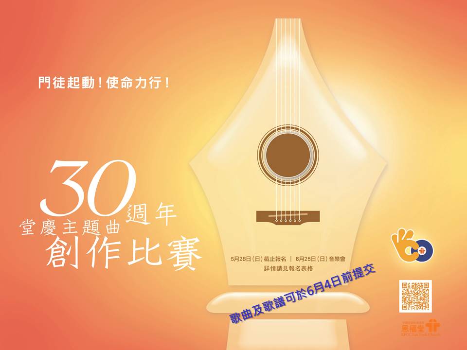 2017年是恩福堂踏入30週年的大日子,從「方方」年代到今天的「永明」,恩福堂一直經歷著神莫大的恩典。作為其中一個30週年堂慶活動,30週年主題曲創作比賽盼望透過創作,以歌詞鼓勵弟兄姊妹回應堂慶主題──門徒起動!使命力行!全民投入實踐門徒生命的服侍。