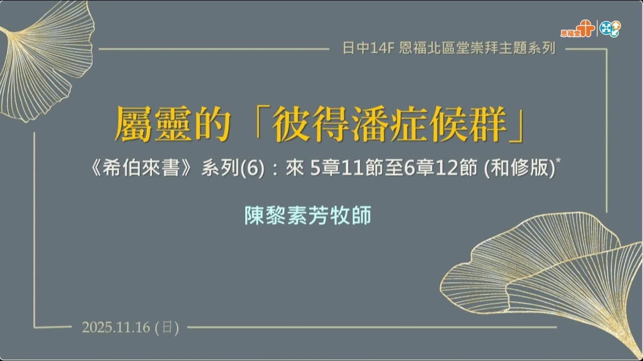 時段:第四址堂崇拜講員:陳黎素芳牧師經文:希伯來書5章11節至6章12節日期:2025-11-16