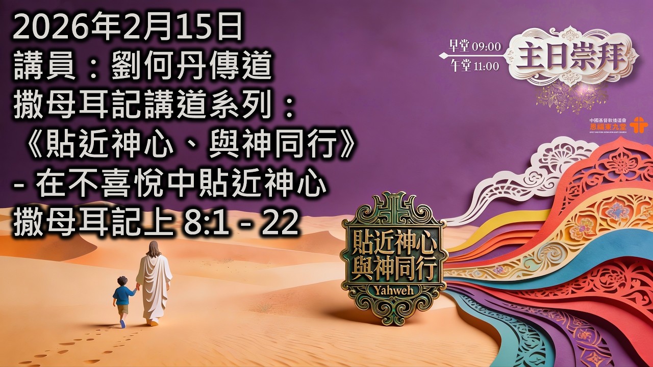 時段:恩福東九堂崇拜-早、午堂講員:劉何丹傳道經文:撒母耳記上 8:1-22 日期:2026-02-15