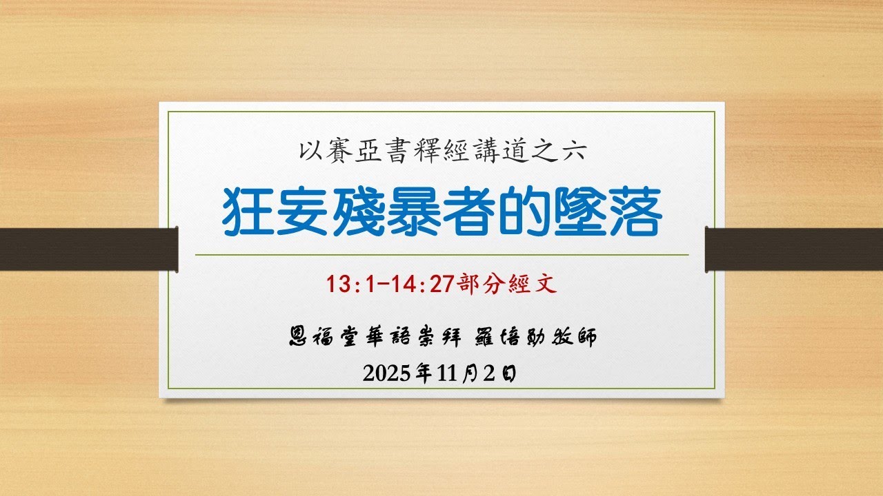 時段:華語崇拜講員:羅培勛傳道經文:以賽亞書13:1-14:27 (新譯本)日期:2025-11-02