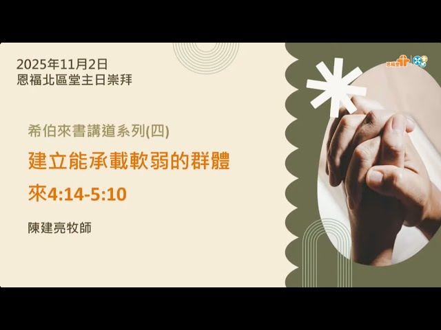 時段:第四址堂崇拜講員:陳建亮牧師經文:希伯來書4章14-5章10節日期:2025-11-02